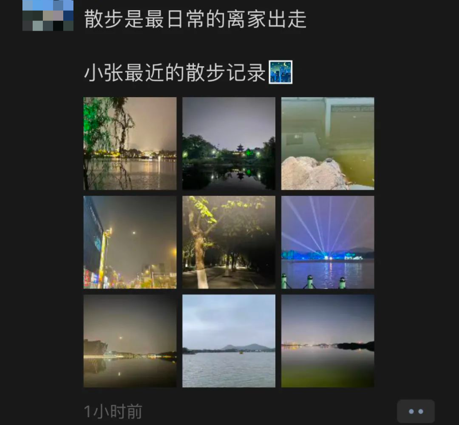 女生用一种很幽默的方式形容自己的散步。在这个语境里,尤其又有这么多配图,很多人一般会集中在散步这个动作上。