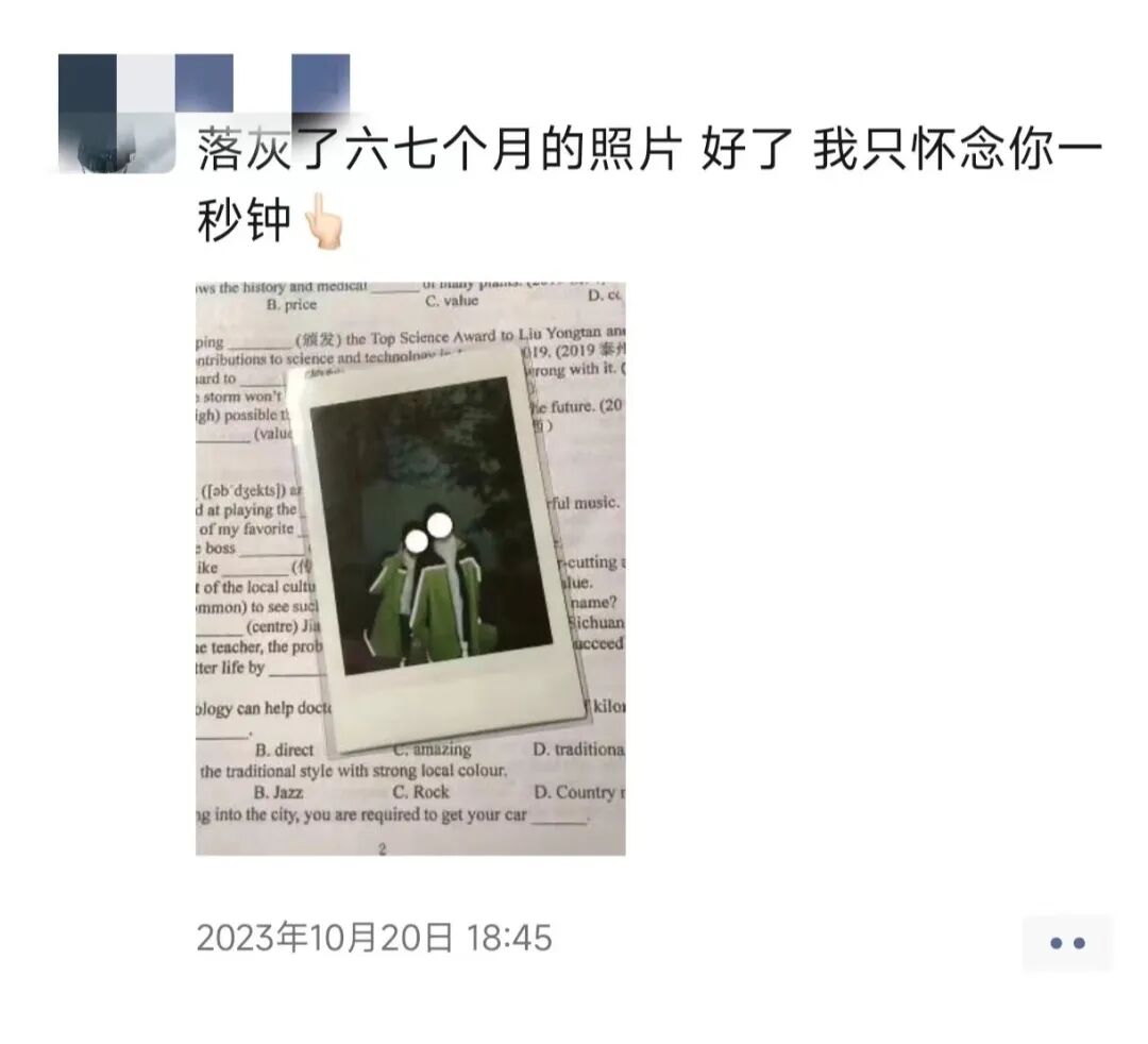 如果这2个人,你是都认识的。再结合女生发的朋友圈文案 “落灰了六七个月的照片 好了 我只怀念你一秒钟。”