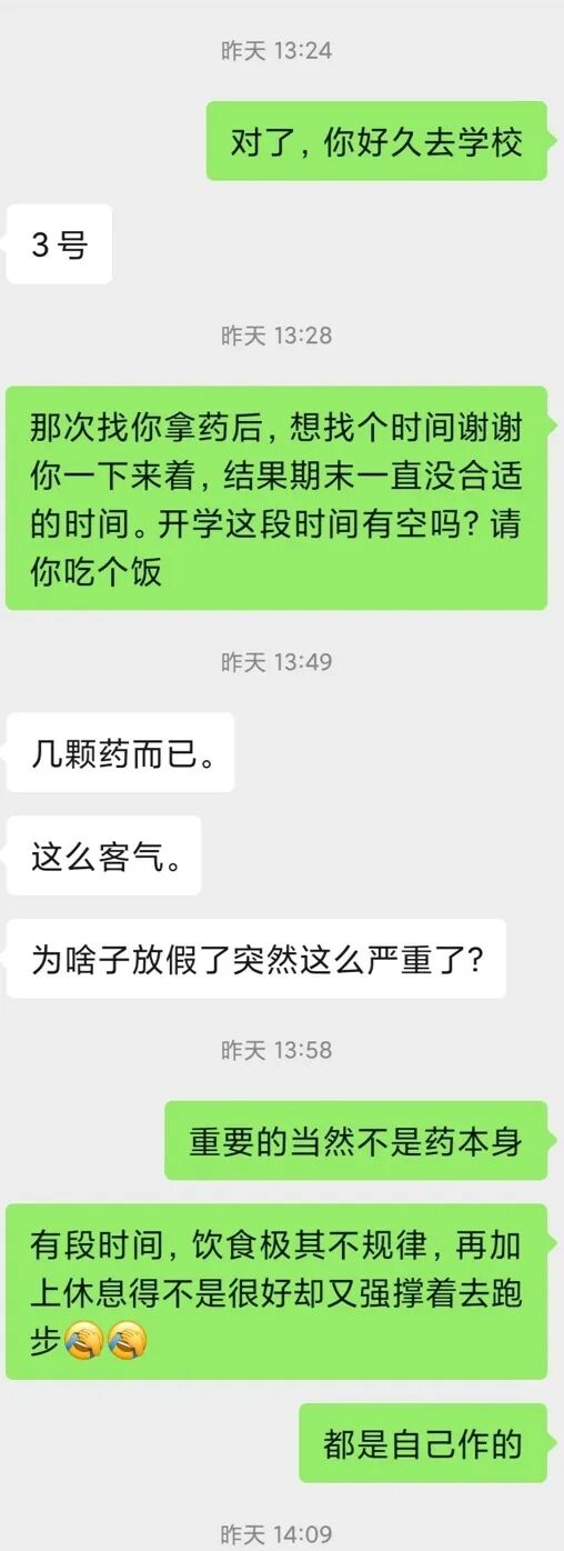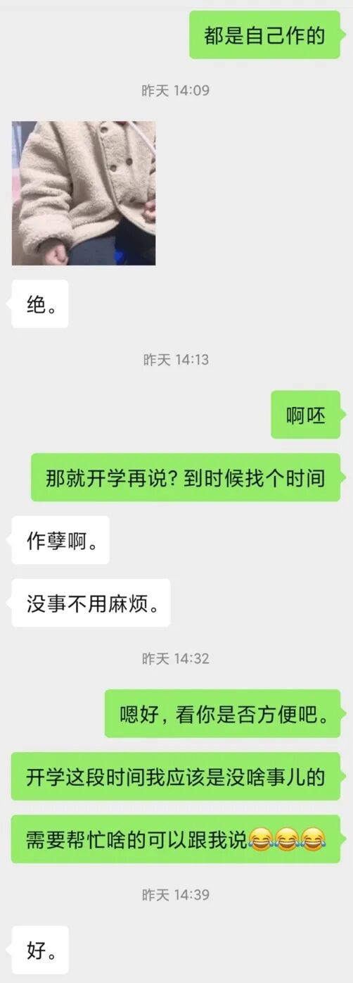 真哥你好,这个女生和我是同专业不同班的同学,偶尔会碰面聊天。认识一年,约过3次,都被委婉的拒绝了。平时关系还不错,会互相关注下对方的情况。这个女生对我到底是啥态度?是我自己的问题,还是她把我当备胎了。下面是最近一次的聊天记录。