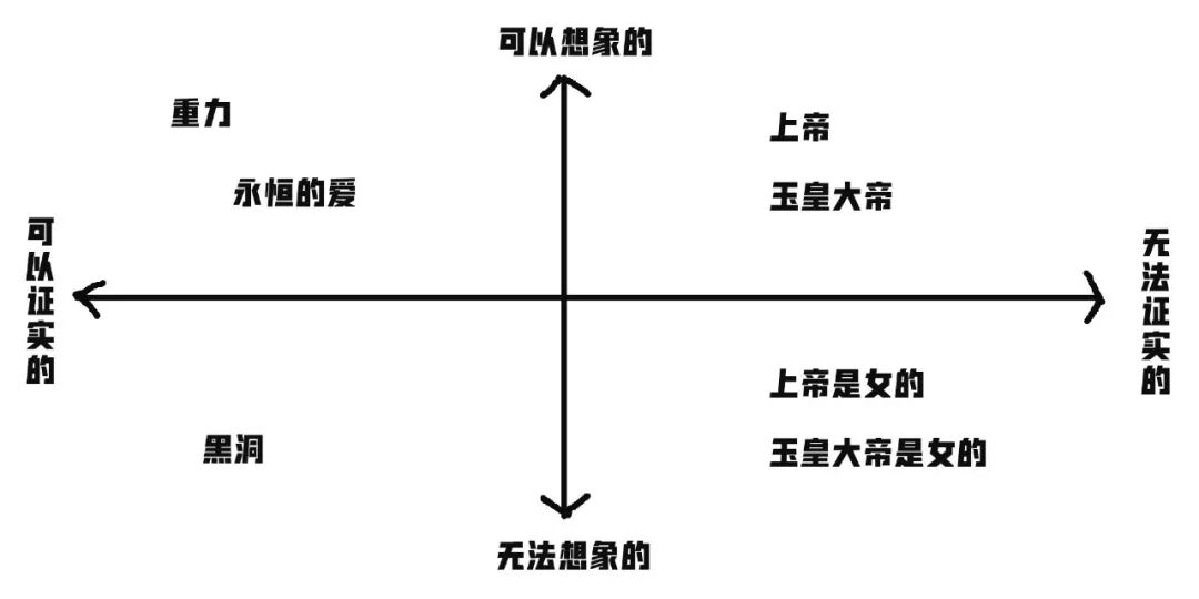 上帝,或者玉皇大帝,是可以被我们想象的,但似乎还无法被证实的。(不被证实不代表不存在,我这里只是举一个例子,我们尊重彼此的信仰。)