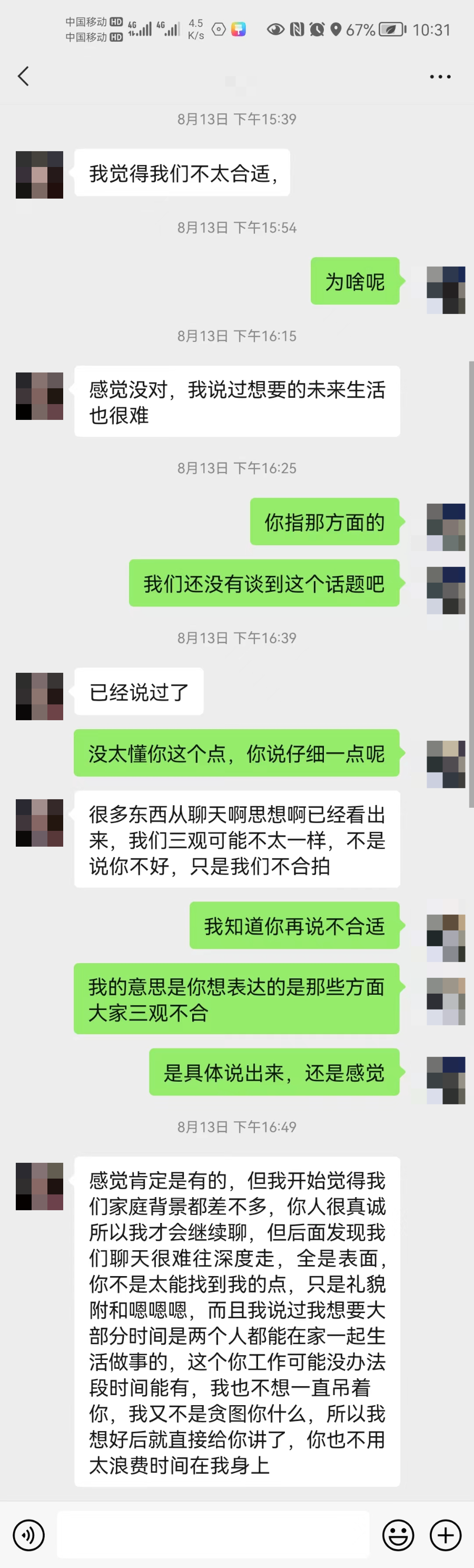 真哥,和这个女生认识两个月了,见了七八次面,但没有牵手,今天离上次见面有一周了,她突然说不合适,说什么想要的生活也很难,没有明白她什么意思,让我有点不太明白她的想法,麻烦真哥分析一下。