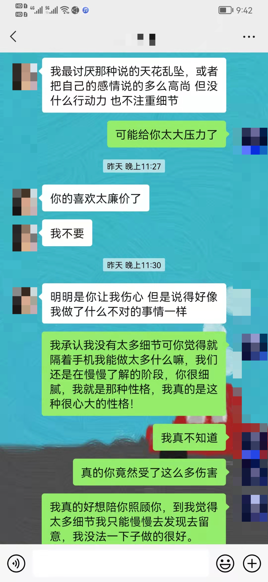 真哥,她现在回学校了,所以我昨天和她联系了一下,问问她是什么意思的。她如果不想处我也就准备放弃的,但是她说的话有点让我不能理解,我不知道是不是真是我的问题,还是她太敏感需要的安全感太多。我真的挺喜欢这个女生的,还是想争取一下的。