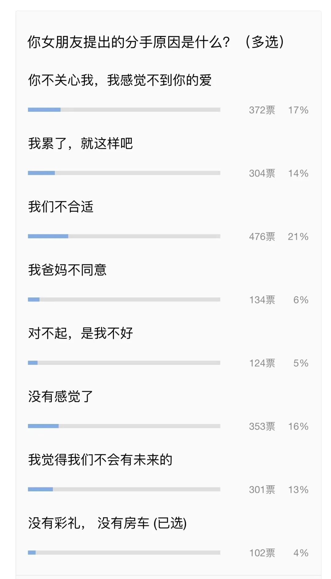 上周的问卷中,排名第一的是“我们不合适”,有21%的哥们都选择了这个原因。