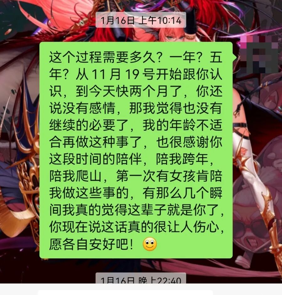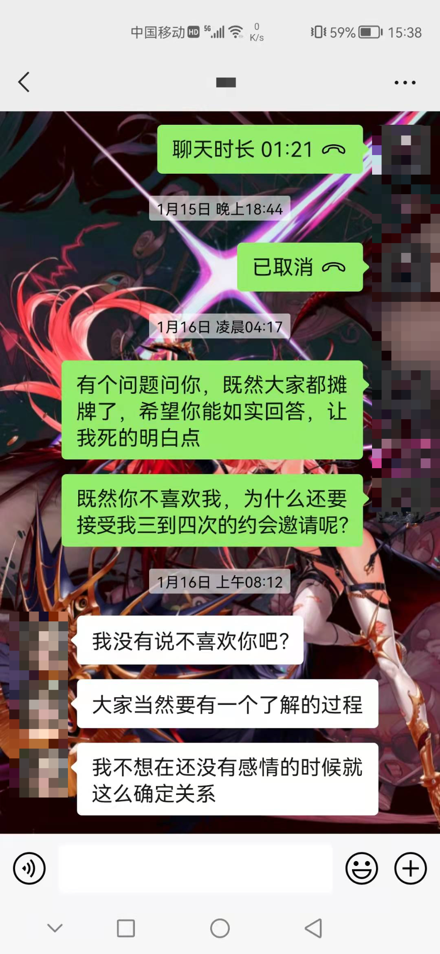 我和这个女生是在大概三月前通过亲戚介绍认识的,期间约会了四次,但是还没牵手,都是吃饭看电影之类的,最后一次约会时我表白了,她没有立刻拒绝,我让她慢慢想几天再给我答复。然后发生了第一张截图的聊天,之后就断联了。除夕那天祝她新年快乐,给她发了一个小红包,她也收了并且回了我一个更小的,看了
