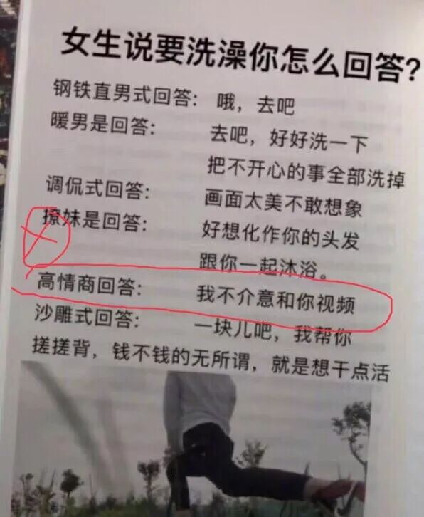 想一下你的答案,然后记在心里。接着我会给出一张图片,是网上说高情商的人应该怎么回答。