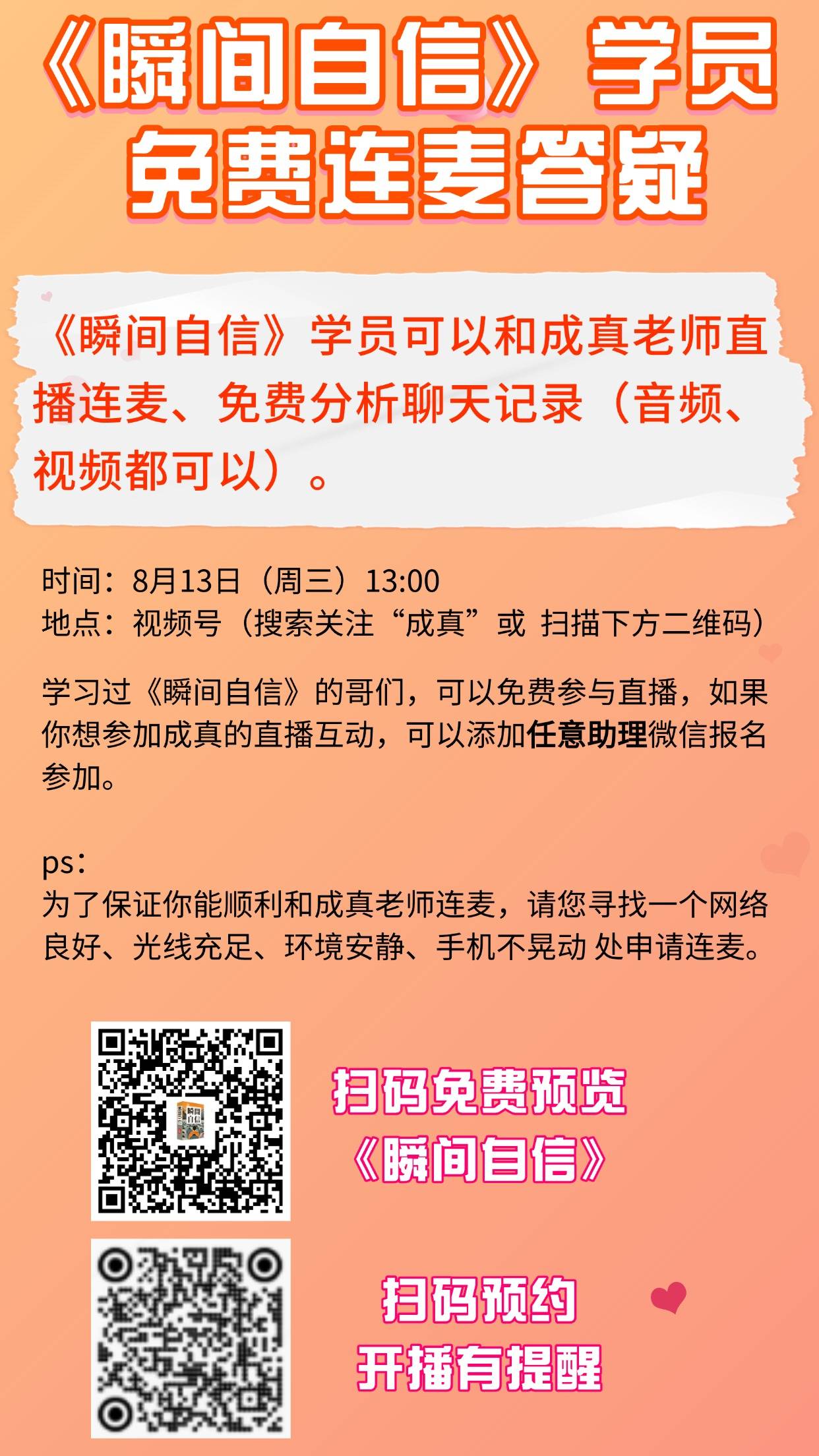 8月13日有一场《瞬间自信》内心建设高级课程学员的专场直播。