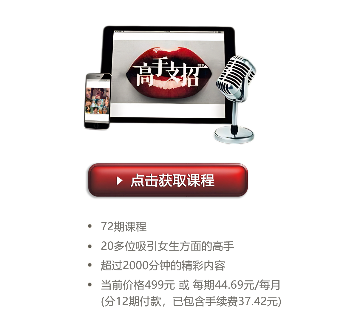 《高手支招》72期和不同“高手”访谈的音频课程里,绝大部分都在讲:追女生,吸引阶段的事,通过里面具体每个哥们鲜活的个人经历,和实际故事,来帮助学习《迷上我》的吸引技巧。